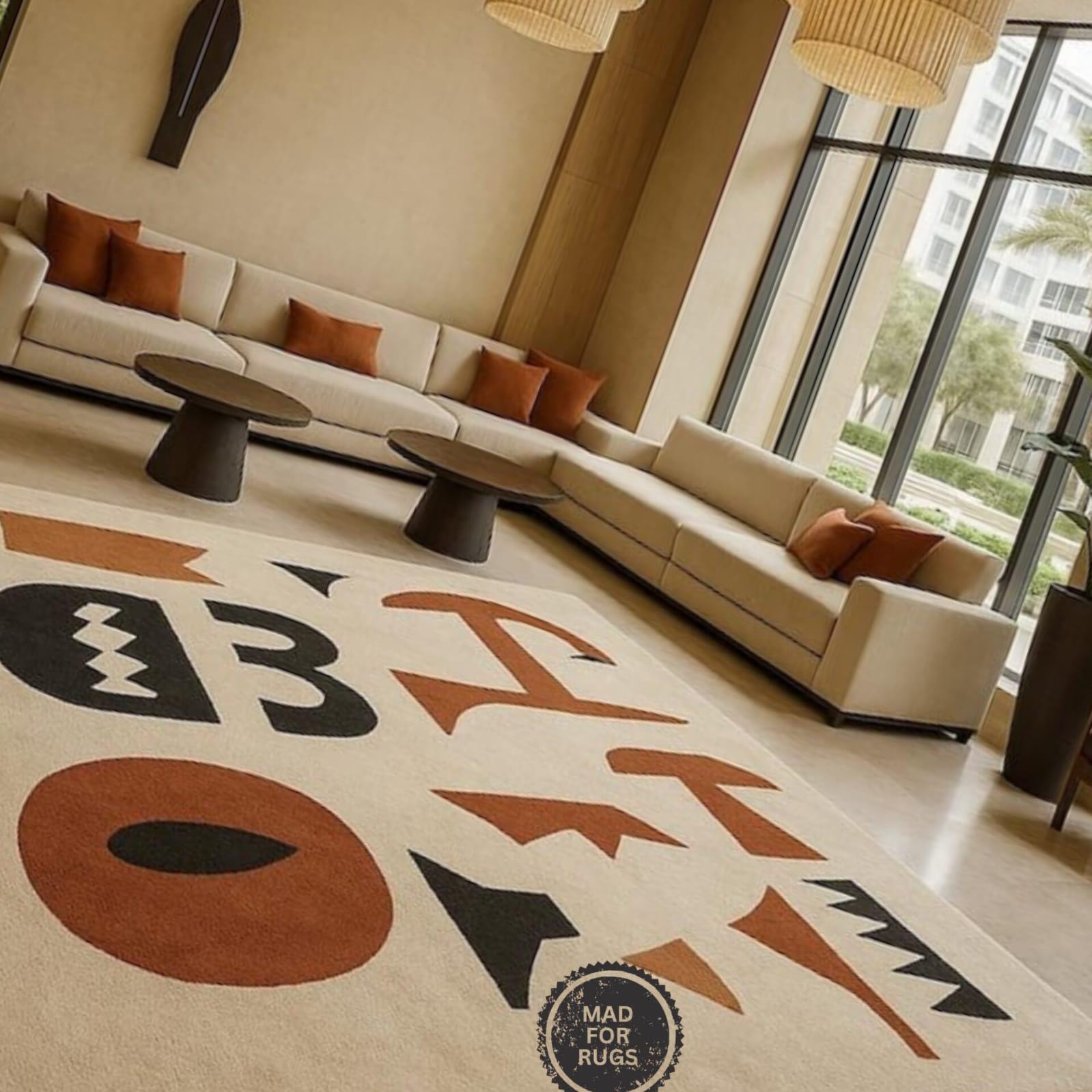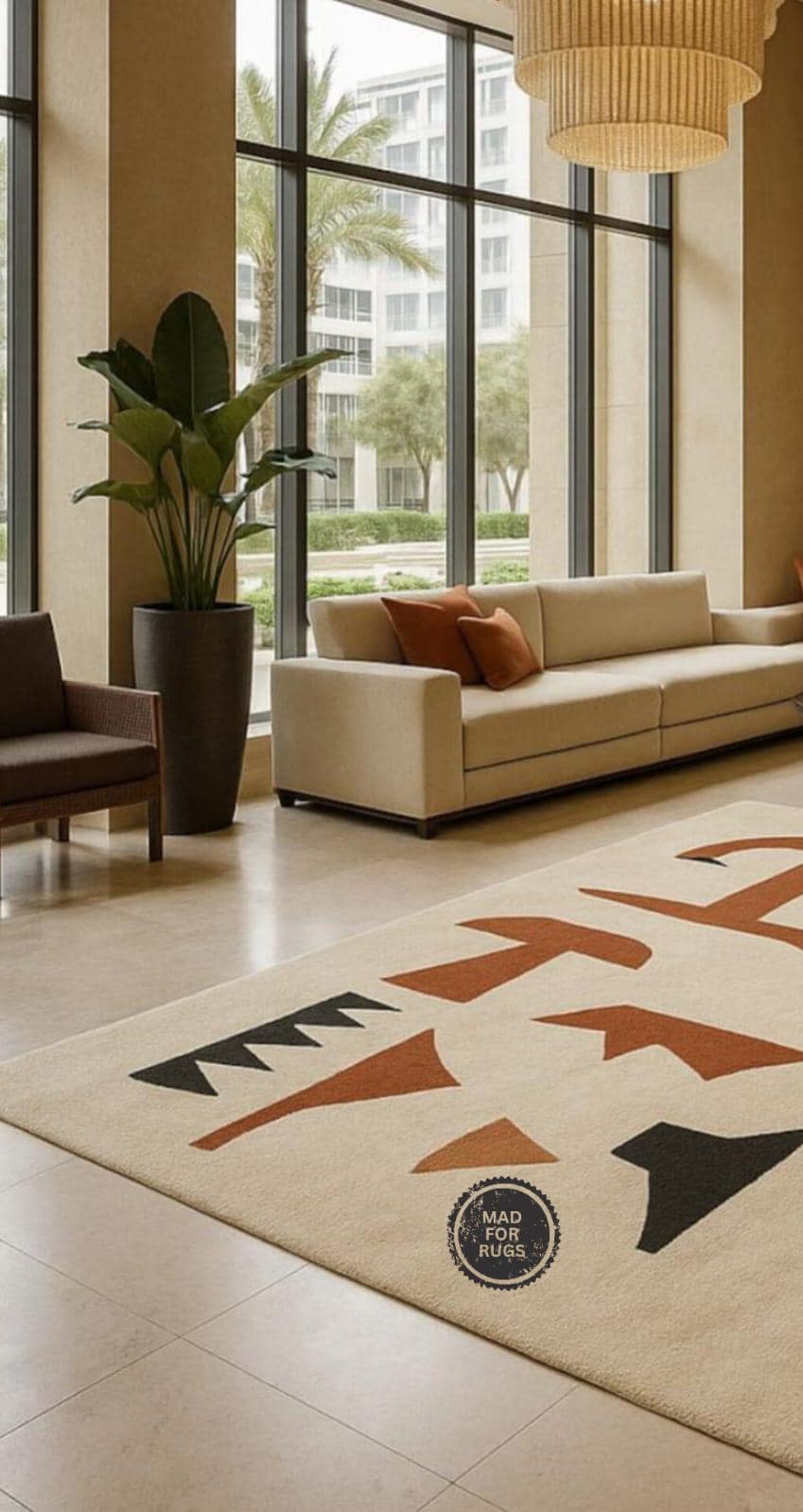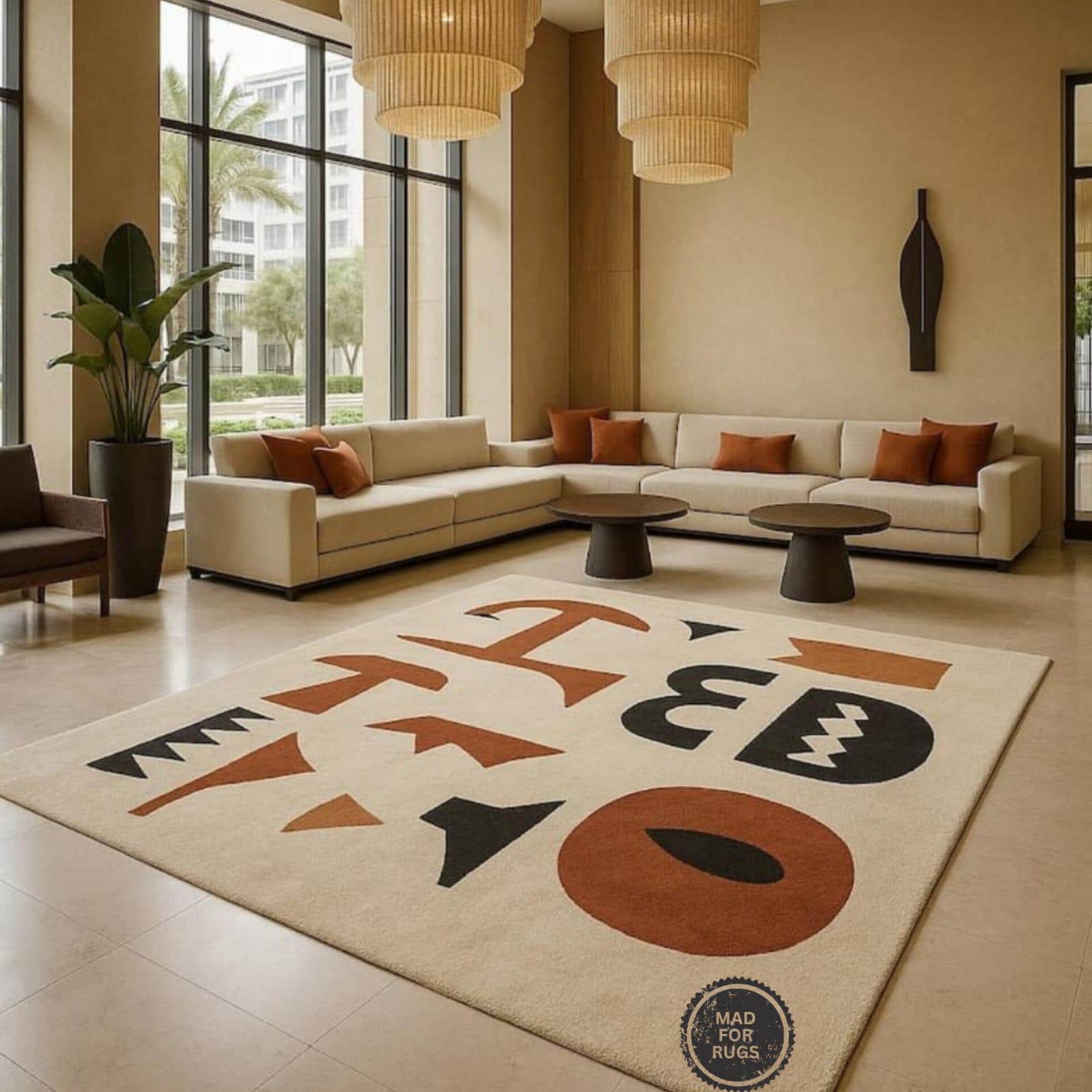Elevate your home décor with this modern abstract area rug, hand-tufted from the finest New Zealand wool for unmatched quality, softness, and durability. Featuring a bold geometric design in earthy tones of beige, rust, and black, this rug is perfect for creating a warm yet sophisticated atmosphere in any room.