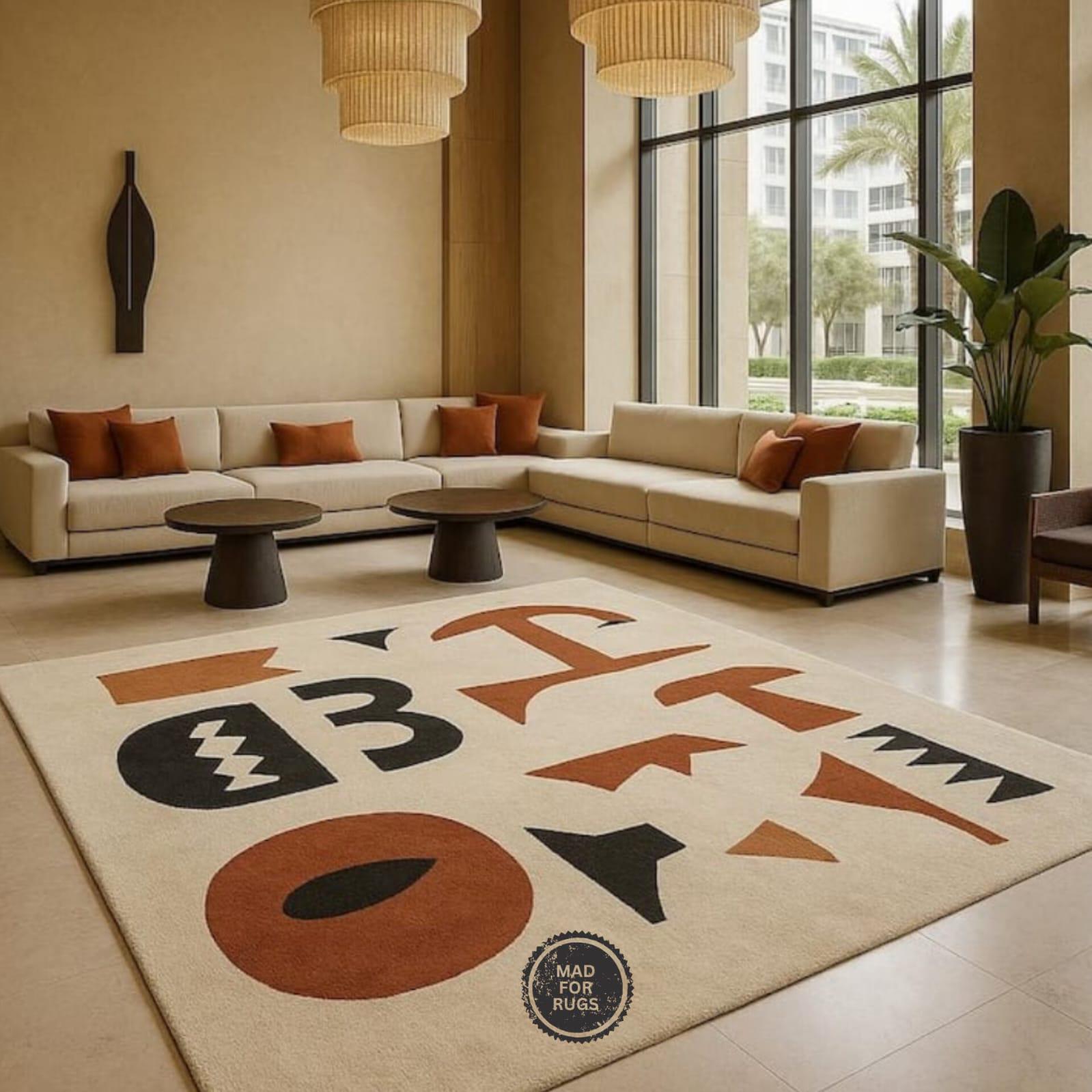 Modern Abstract Area Rug | Hand Tufted Wool Carpet | Geometric Living Room Rug | Contemporary Beige, Black & Rust Designer Floor Rug